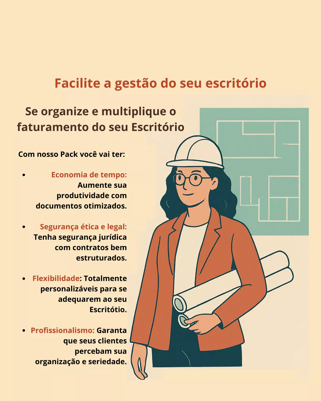 Com o Pack Arquitetura, tenha acesso a mais de 25 documentos profissionais que vão otimizar o seu tempo e garantir a qualidade dos seus projetos. Não perca mais tempo criando documentos do zero. Aproveite a oferta especial e adquira agora o Pack Arquitetura por um preço imperdível.